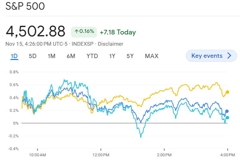 이런 좋은 소식들이 쏟아졌지만, 뉴욕 증시의 주요 지수는 0.3% 수준의 소폭 상승세로 출발했습니다. 그리고 종일 그 수준에 머물렀습니다. 결국, 다우는 0.47% 올랐지만, S&P500 지수는 0.16%, 나스닥은 0.07% 상승하는 데 그쳤습니다. 어쨌든 S&P500지수는 4500선에, 나스닥지수는 14000대에 안착했습니다.