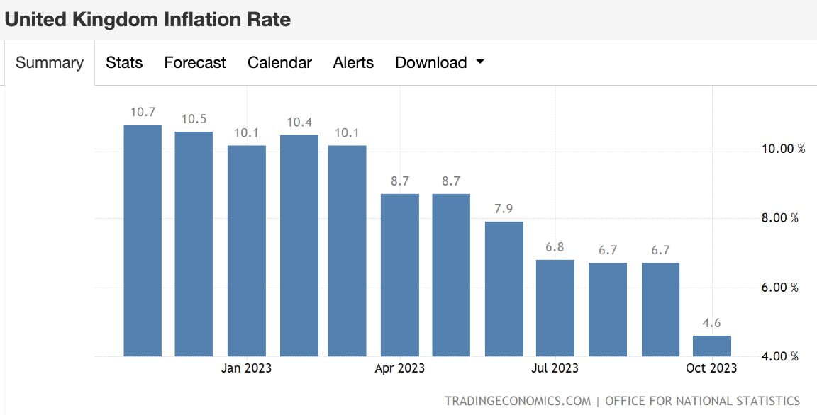 새벽에 나온 영국의 10월 CPI도 9월(6.7%)보다 크게 낮은 연 4.6%로 집계됐습니다. 2022년 10월 최고치인 11.1%에 비하면 절반 이상 낮아진 것이죠. 전월 대비로는 하나도 오르지 않았습니다(0%). ING는 "에너지 가격 하락뿐 아니라 서비스 인플레이션이 정점에 이르렀고 하락 추세에 있다는 점을 확신할 수 있다. 영국은행의 다음 움직임은 기준금리 하락이 될 가능성이 크다"라고 밝혔습니다. 시장은 영국은행이 내년 6월 금리를 인하할 것으로 베팅했습니다.