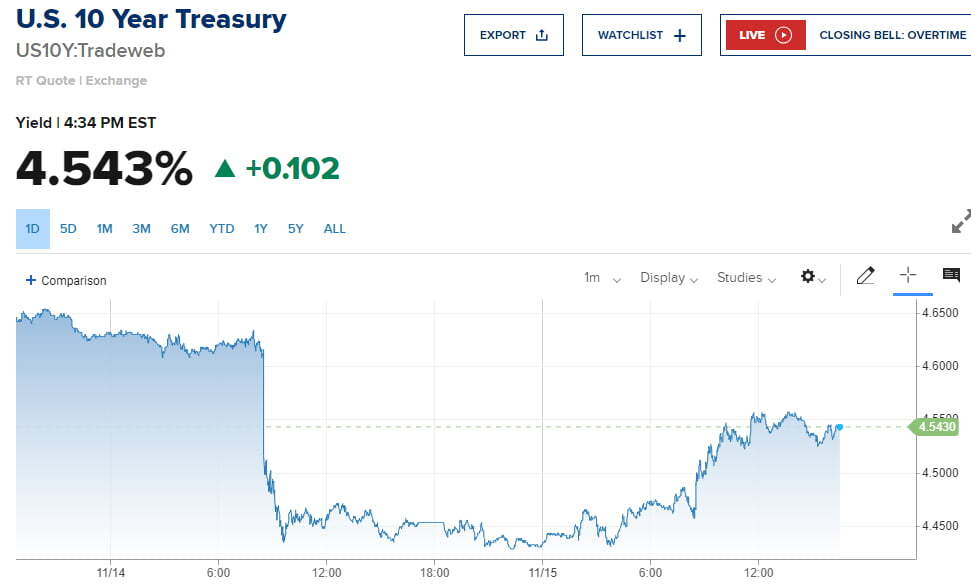 전날 미국의 10월 소비자물가(CPI)가 예상보다 둔화했던 데 따른 흥분은 15일(미 동부시간) 아침까지 이어졌습니다. 헤드라인 CPI는 한 달 전에 비해선 전혀 오르지 않았고, 에너지와 식품을 제외한 근원 CPI는 0.23% 오르는 데 그쳤죠. 1년 전보다는 각각 3.2%, 4.0% 상승했고요.