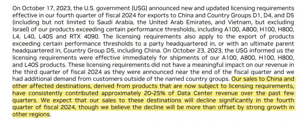 이는 중국 매출에 대한 우려 탓입니다. 엔비디아는 "미국 연방정부 허가가 필요한 제품의 중국 판매가 몇 분기 동안 지속해서 데이터센터 매출의 약 20~25%에 이바지해 왔다. 중국에 대한 판매가 다음 분기에 크게 감소할 것으로 예상한다. 하지만 이러한 감소가 다른 지역의 강력한 성장으로 상쇄되고도 남을 것이라고 믿는다"라고 밝혔습니다. JP모건은 195억 달러에서 200억 달러에 이르는 다음 분기 매출 가이던스(컨센서스를 상회하지만)가 시장의 마음에 들지 않은 것 같다"라고 지적하기도 했습니다.