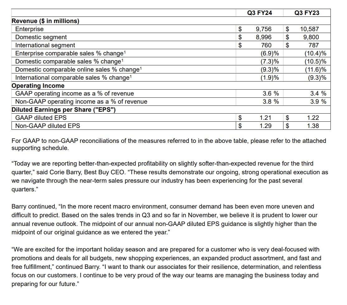 베스트바이는 지난 10월 28일에 끝난 회계연도 3분기에 97억6000만 달러의 매출을 기록했는데, 이는 1년 전보다 7.3% 감소한 것입니다. 예상치 99억 달러도 밑돌았습니다. 3분기 순이익은 2억6300만 달러(주당 1.21달러)로 전년 동기의 2억 7700만 달러(주당 1.22달러)보다 5% 줄었습니다. 베스트바이는 4분기 동일매장 매출이 3~7% 감소할 것으로 예상했습니다. 매트 빌루나스 CFO는 "11월의 지금까지 매출이 줄어왔으며, 7% 가까이 감소했다"라고 설명했습니다.
