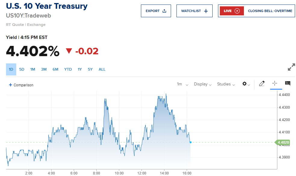 매파적 FOMC 회의록이 나왔지만, 채권 시장에서 금리는 오히려 하락세를 나타냈습니다. 오후 4시 20분께 10년물 수익률은 전날보다 2bp 내린 4.402%, 2년물은 3bp 내린 4.881%에 거래됐습니다.