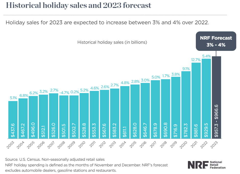 전반적으로는 작년보다는 늘겠지만, 그렇게 강하진 않을 것이란 전망입니다. 전미소매업연맹(National Retail Federation)은 올해 11~12월 연말 쇼핑시즌 지출이 작년보다 3~4% 증가할 것으로 전망합니다. 팬데믹 이후 지난 3년간 증가율(2020년 9.1%, 2021년 12.7%, 2022년 5.4%)에 비해 낮지만, 팬데믹 이전 10년(2010~2019년) 연평균 3.6%와 일치하는 수준입니다. NRF의 매튜 셰이 사장은 "연말 매출 증가율이 팬데믹 이전 수준으로 되돌아가는 것은 놀라운 일이 아니다. 전반적인 가계 재정은 양호하며 소비자의 지출 능력을 계속 지원할 것"이라고 말했습니다.