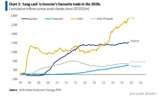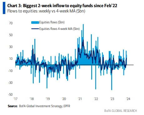 뱅크오브아메리카는 오늘 EPFR의 수치를 인용해 지난 21일까지 한 주 동안 투자자들이 글로벌 주식형 펀드에 165억 달러를 추가 투자했다고 밝혔습니다. 지난 2주 동안을 따지면 세계 주식 펀드에 약 400억 달러가 유입되었는데 이는 2022년 2월 이후 가장 많은 것이라고 설명했습니다. 또 지난주 채권형 펀드에는 40억 달러가 유입됐고, 가장 많은 돈이 몰린 곳은 역시 머니마켓펀드로 400억 달러가 몰렸습니다.
