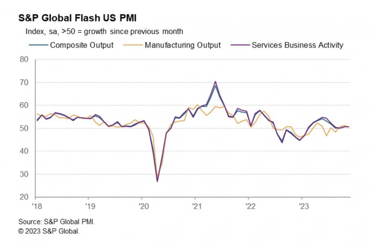오늘 아침 9시 45분, S&P글로벌이 발표한 구매관리자지수(PMI)는 이런 상황을 대변했습니다. 제조업의 11월 PMI(예비치)는 49.4로 10월(50.0)이나 월가 예상(49.9)보다 살짝 낮게 나왔습니다. 50 이하는 위축 국면임을 나타냅니다. 반면 서비스업 PMI는 50.8로 집계되어 10월(50.6)이나 예상(50.3)보다 살짝 높았습니다. 넉 달 만에 가장 높은 수준입니다. 이 둘을 합친 합성 PMI는 50.7로 10월과 같았습니다.