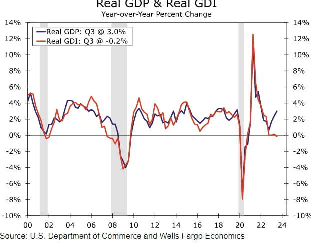 네드 데이비스 리서치는 "기업들의 비주거용 고정투자는 올해 반도체 법(CHIPS Act)의 인센티브로 인해 일시적으로 증가한 것으로 다음 분기에는 줄어들 것으로 예상한다. 정부 부양책도 2024년에는 그 영향력이 줄어들 것이고 통화정책은 여전히 제약적이어서 GDP 성장률은 크게 둔화할 것으로 예상한다"라고 밝혔습니다. 실제 골드만삭스는 3분기 GDI가 GDP 증가율보다 훨씬 낮게 발표된 뒤 4분기 GDP 성장률 전망치를 기존보다 0.5%포인트 낮은 1.4%로 떨어뜨렸습니다.