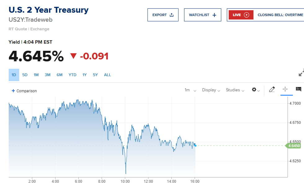 미국의 금리가 뚝뚝 떨어지고 있습니다. 29일(미 동부시간) 아침에 미 국채 10년물 금리는 연 4.253%까지 내려가기도 했습니다. 2년물은 4.608%까지 떨어지고요.