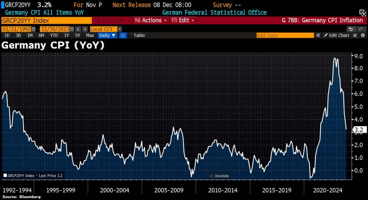 오늘 유럽에서는 월러의 생각을 확인시켜주는 데이터가 쏟아졌습니다. 독일의 11월 소비자물가(CPI) 예비치는 전년 동월 대비 3.2% 상승한 것으로 집계됐습니다. 10월 3.8%보다 크게 낮아지면서 2021년 6월 이후 가장 낮은 수준을 기록했습니다. 예상치 3.5%도 밑돌았습니다. 1년 전에만 해도 독일의 CPI는 두 자릿수 대였습니다. 에너지와 식품을 제외한 근원 CPI도 2.3% 상승(10월 3.0%)에 그쳤습니다. 스페인의 11월 CPI 상승률도 3.2%를 기록하며 전 월 3.5%를 밑돌았습니다. 이에 유럽에서도 유럽중앙은행(ECB)이 금리 인상을 멈추고 내년에는 인하로 전환할 것이란 예상이 쏟아졌습니다. 에쿼티 캐피탈의 스튜어트 콜 이코노미스트는 로이터에 "ECB가 향후 더 강력한 금리 인하 압박에 시달릴 것"이라고 말했습니다. 또 호주에서는 10월 CPI가 나왔는데 4.9% 올라 9월 5.6%, 예상 5.2%를 밑돌았습니다.