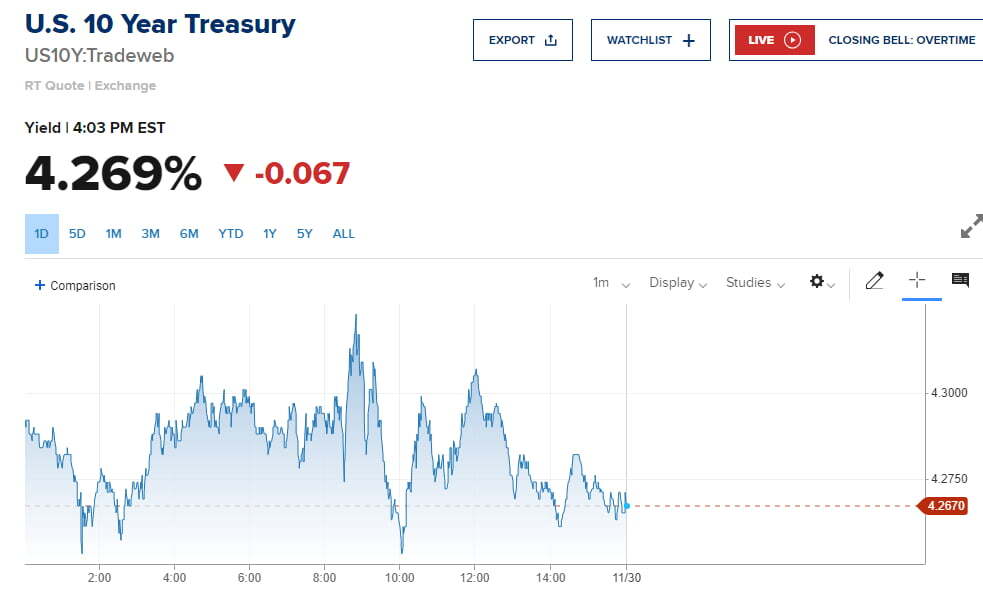 펀드스트랫의 마크 뉴튼 기술적 분석가는 "10년물 수익률이 지지선에 가까워진 것으로 보인다. 나는 10년물이 금세 4.25%를 깨고 내려갈 것으로 보지 않는다. 2024년까지 4.0% 아래로 하락할 것으로 예상하지 않는다. 미국 달러와 함께 미 국채 수익률은 다음주에 (발생할 수 있는) 바닥에 가까워야 한다"라고 밝혔습니다.