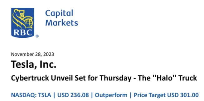 테슬라는 내일 사이버트럭 인도 행사를 앞두고 오늘 1.05% 내렸습니다. RBC는 "사이버트럭은 확실히 (기대가 크게 엇갈리는) 양극화 제품이다. 우리는 사이버트럭이 재정적으로 큰 어려움을 가져올 것으로 보지 않는다. 오히려 지난 몇 년 동안 그 빛의 일부를 잃었을 테슬라 브랜드에 활력을 불어넣을 수 있는 제품으로 본다"라고 주장했습니다.