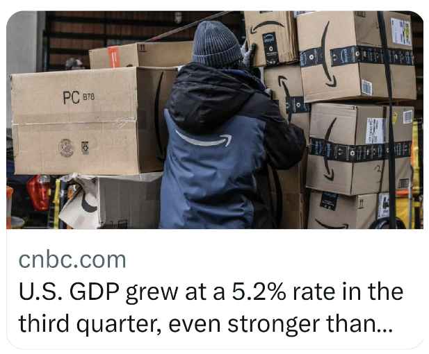 아침 8시 30분 미국의 3분기 국내총생산(GDP) 증가율이 지난달 속보치 연율 4.9%보다 높은 5.2%로 상향 수정되어 발표됐습니다. 예상치 5.0%도 넘었습니다. 미국은 GDP를 속보치와 잠정치, 확정치로 세 번에 걸쳐 발표합니다. 통상 성장률이 이렇게 높다면 경기 둔화와 인플레이션 하락을 기대해온 시장에 부정적 영향을 줄 수 있습니다. 하지만 시장은 이를 즐겁게 받아들였습니다. 세부 내용에서 경기와 소비, 물가가 둔화하고 있다는 데이터가 드러난 덕분입니다.