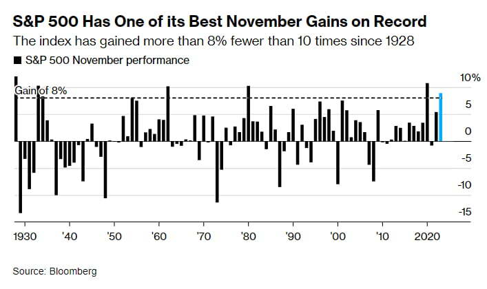 11월 미국 주식과 채권은 엄청난 랠리를 벌였습니다. 다우는 지난 한 달 동안 8.8%, S&P500 지수는 8.9% 상승했고, 나스닥은 10.7%나 올랐습니다. S&P500 지수를 기준으로 이는 2022년 7월 이후 가장 많이 오른 것입니다.