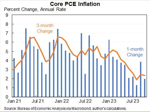 근원 물가의 전월 대비 수치는 소수점 둘째 자리까지 따지면 0.16% 올랐는데요. 지난 6개월간 전월 대비 상승률을 연율로 환산하면 2.5%가 됩니다. 3개월간 상승률을 환산하면 2.4%가 되고요. Fed의 물가 목표 2%와 그리 멀리 않은 것이죠. 6개월 전만 해도 6개월 연율 환산 수치는 4.5%에 달했습니다. 극적으로 둔화한 것입니다.