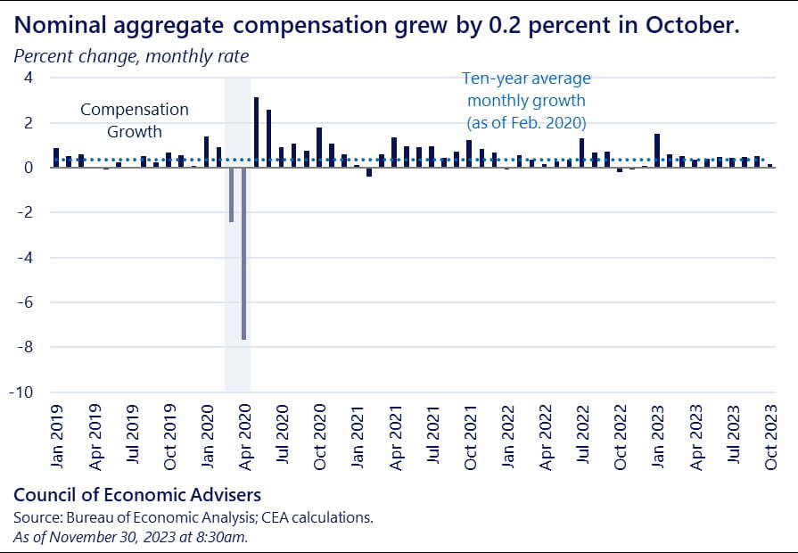 PCE 보고서에 포함된 10월 개인 소득은 전월 대비 0.2% 증가했습니다. 9월의 0.4% 증가보다 증가율이 낮아졌습니다. 10월 개인 지출은 명목 및 실질 모두 0.2% 올랐습니다. 이는 5월 이후 가장 느린 증가세입니다. 9월의 각각 0.7%, 0.3% 증가보다 둔화해 소비 증가 속도가 한풀 꺾였음을 보여줬습니다. 실질 지출이 전월 대비 0.2% 증가한 것은 4분기 GDP가 연율 2%대 성장 궤도에 진입했음을 의미합니다. 인플레이션을 잡기에 적절한 수준이죠. 오늘 애틀랜타 연방은행의 'GDP나우'는 4분기 GDP 증가율 추정치를 기존 2.1%에서 1.8%로 낮췄습니다.