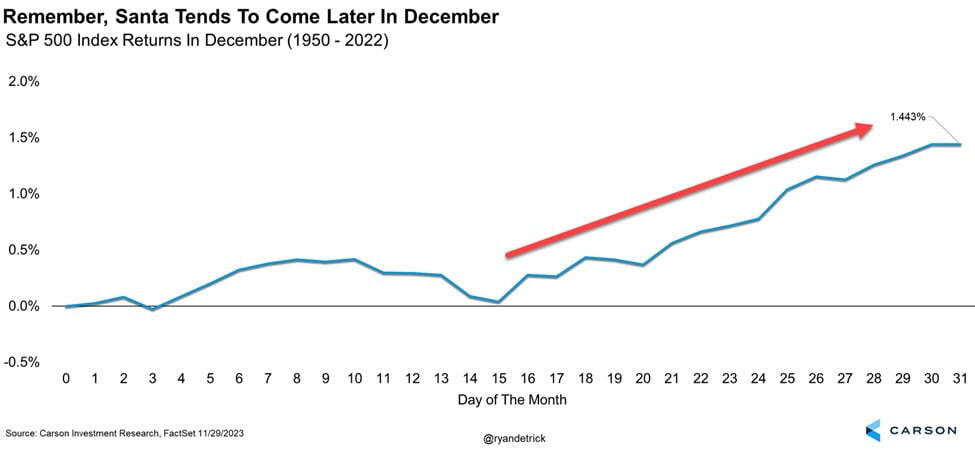 칼슨 그룹의 라이언 디트릭 전략가는 12월에도 강한 상승세가 이어질 것이라고 주장합니다. 다만 그런 상승세는 12월 후반에 집중됩니다. 12월 초반에는 박스권 장세가 이어집니다. 그는 재미없는 장세가 이어져도 주식을 팔지 말고 기다릴 것을 권합니다.