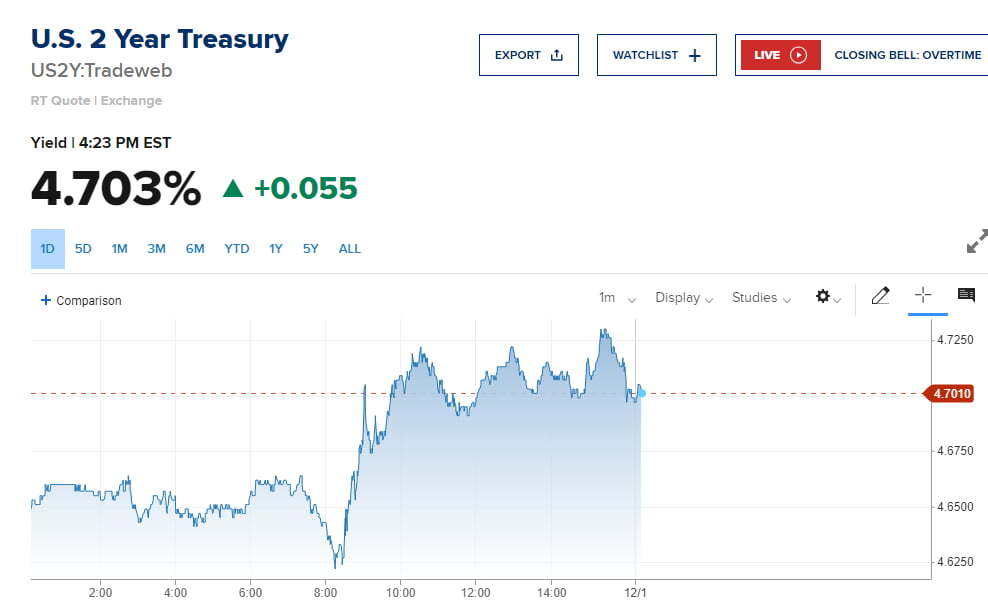 PCE 물가 발표 직전 보합권에 머물던 금리는 상승세를 보이기 시작했습니다. 넷얼라이언스의 앤드류 브레너 채권 헤드는 "모두가 좋은 PCE 데이터를 예상했고 수치가 발표됐을 때는 모두가 매수 포지션에 있었다. 그래서 소화불량이 일어났다. 그리고 시카고 11월 제조업 구매관리자지수(PMI)가 예상보다 20% 높은 것으로 발표됐고, OPEC+는 추가 감산을 할 것이란 소식이 전해졌다. 그래서 채권시장은 랠리를 멈추고 물러섰다"라고 분석했습니다.