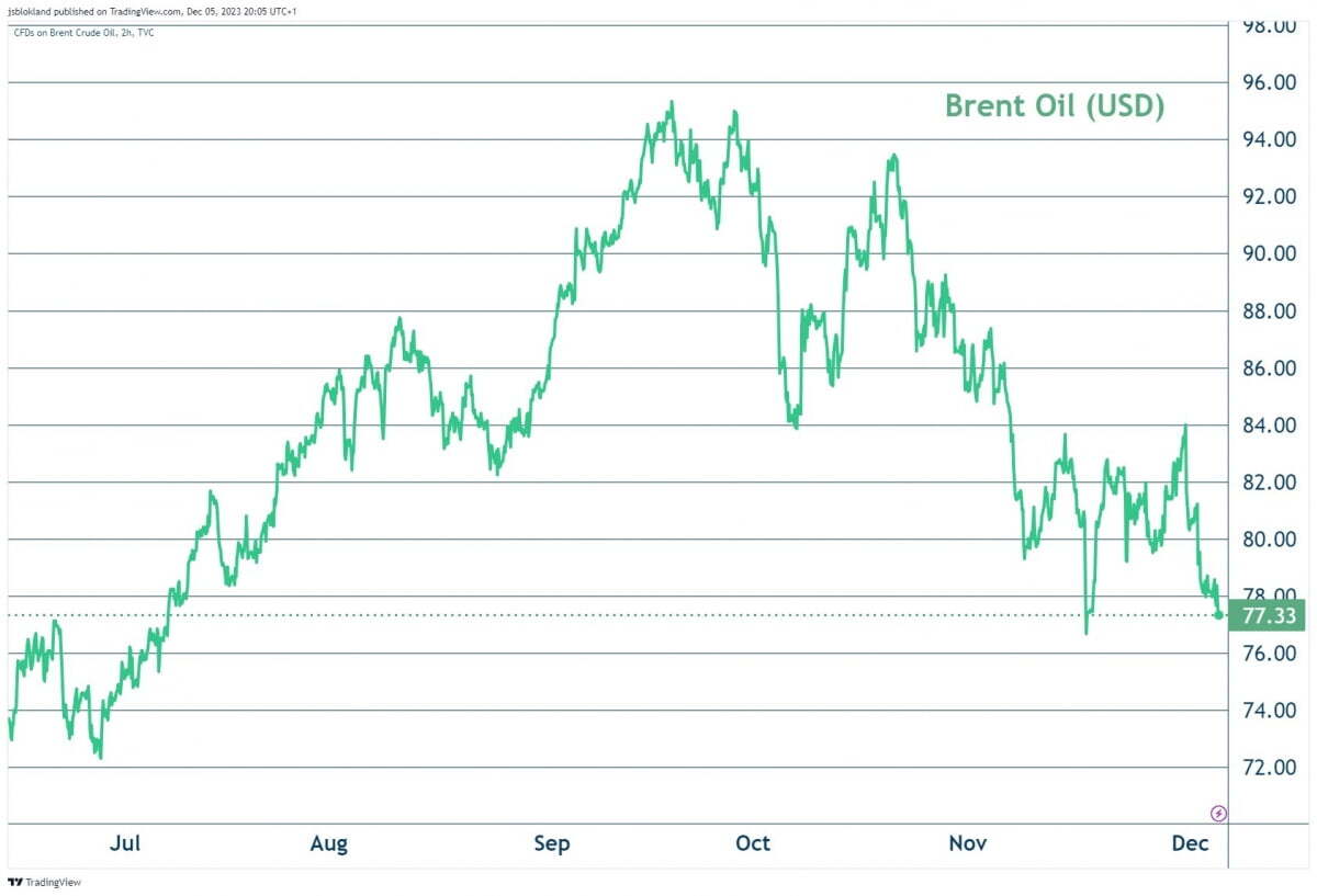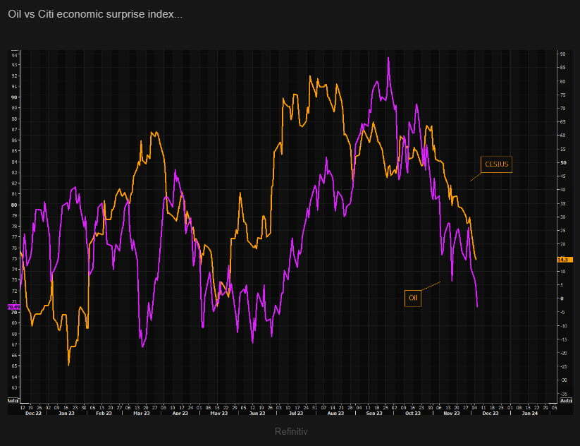 오늘 아침 발표된 독일의 10월 제조업 주문은 예상보다 크게 감소(전월 대비 -3.7%)했습니다. 경기 둔화, 물가 둔화 속에 투자자들은 이제 내년에 세계적인 금리 인하가 이어질 것으로 예상합니다. 투자자들은 유럽중앙은행(ECB)이 내년 3월부터 금리를 내려 모두 6번 인하할 것이라고 베팅하고 있습니다. 도이치뱅크는 오늘 ECB의 금리 인하 시기를 기존 6월에서 4월로 조정하고 3월에 내릴 가능성도 상당하다고 주장했습니다. 내년 금리 인하 폭도 100bp에서 150bp로 확대했습니다. 투자자들은 또 미국 Fed는 내년 5월부터 다섯 번 내릴 것으로 베팅합니다. 영국 중앙은행은 6월부터 세 차례 인하할 것으로 가격에 책정하고 있고요. 오늘 캐나다 중앙은행은 통화정책 회의에서 기준금리를 동결하고 "필요하다면 정책금리를 더 인상할 것”이라고 밝혔습니다. 하지만 시장은 캐나다가 기존 성명서의 "물가 안정에 대한 진전이 더디고, 인플레이션 위험이 증가한 점을 우려한다"라는 문구를 삭제한 것을 주시하면서 다음 움직임은 금리 인하가 될 것이라고 베팅했습니다.