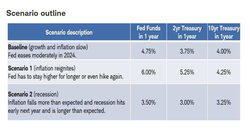금리와 관련, 찰스 슈왑은 "인플레이션 하락과 성장 둔화로 인해 단기 및 장기 수익률이 모두 이번 사이클 최고점에 도달했을 수 있다. 2024년 인플레이션이 완화된다는 가정하에 계속해서 하락할 것이라고 믿는다. 다만 2024년 금리 하락 전망은 간단하지만, 그 길은 험난할 가능성이 크다. 인플레이션 하락과 경제 둔화에 따라 채권 수익률도 하락할 것으로 예상하나, Fed 움직임에 대한 불확실성이 변동성의 원인이 될 가능성이 높다"라고 분석했습니다. 그러면서 세 가지 시나리오를 제시했습니다.