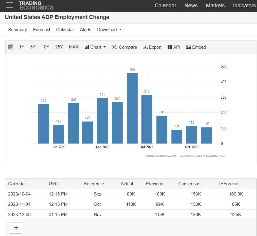 6일(미 동부시간) 아침 8시 15분에 고용정보업체 ADP가 발표한 11월 민간고용은 10만3000개 증가한 것으로 나타났습니다. 시장 예상 12만8000개보다 낮게 나온 것이죠. 10월 수치도 11만3000개에서 10만6000개로 하향 조정되었습니다.