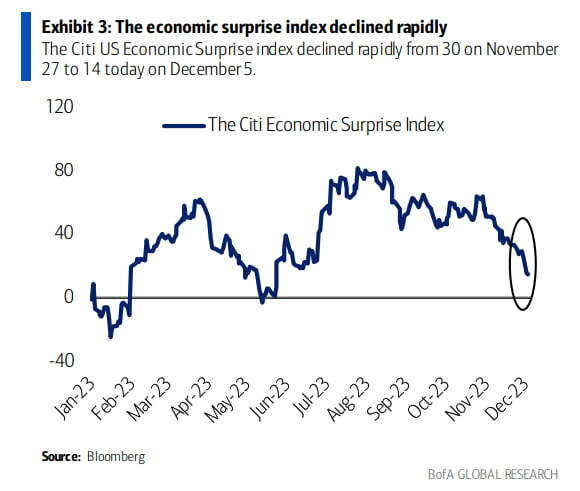 월가 일부에서는 경기 둔화에 대한 우려가 또다시 나오고 있습니다. 너무 빠른 금리와 유가 하락은 예상보다 빠른 경기 둔화를 예상하는 것으로 볼 수 있다는 얘기(LPL 파이낸셜)입니다. 골드만삭스의 트레이딩 데스크에서도 "나쁜 뉴스가 나쁜 뉴스가 될 수 있다"라는 경고가 나왔습니다. 그동안은 경제 데이터 악화가 물가 둔화, Fed의 긴축 중단을 이끄는 좋은 뉴스로 여겨졌지만, 앞으로는 경기 침체 우려를 자극할 수 있는 나쁜 뉴스가 될 수 있다는 것이죠. 그러면서 경기순환주에 대한 공매도를 추천하기도 했습니다. 웰스파고 자산운용의 데럴 크롱크 최고투자책임자(CIO)는 "제조업, 주택시장, 해외 성장의 순차적 둔화로 인해 단계적 경기 약화가 분명해졌다. 경제적 역풍으로 인해 미국은 2024년 초부터 적당히 둔화하면서 내년 성장률은 0.7%에 그칠 것이다. 우리는 2024년에도 방어적 포지셔닝을 유지할 것”이라고 말했습니다. 트레이드스테이션의 데이비드 러셀 전략가는 “ADP 데이터는 Fed의 긴축이 이제 실제로 효과를 보이고 있음을 보여준다. 각종 수치는 연착륙을 향하고 있지만, 통화정책이 너무 강경하게 유지된다면 투자자들은 경기 침체에 대해 걱정하기 시작할 수 있다"라고 지적했습니다.
