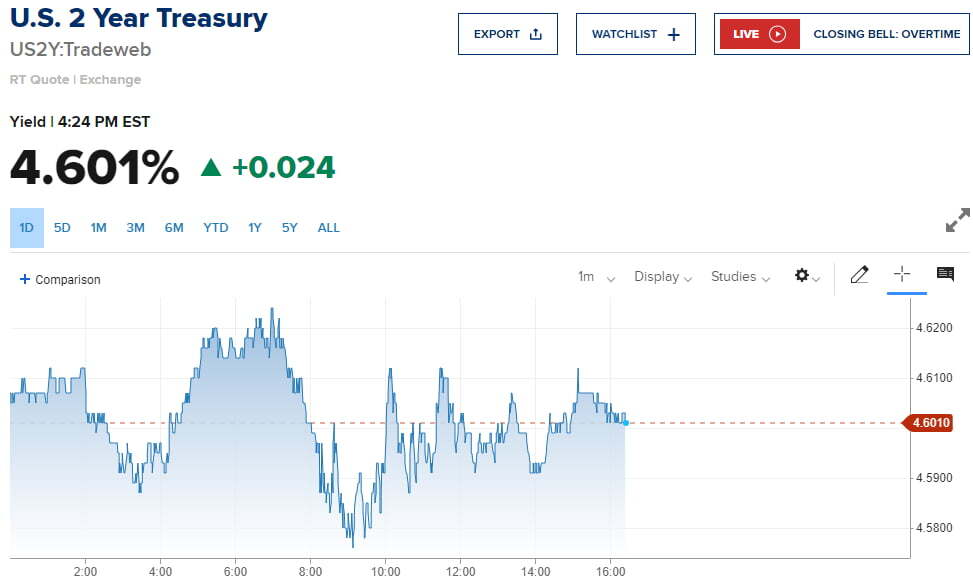 오늘 오후 4시 20분께 미 국채 10년물 수익률은 5.4bp 하락한 4.117%에 거래됐습니다. 2년물은 시간이 흐르면서 반등해 2.4bp 상승한 4.601%를 기록했습니다.