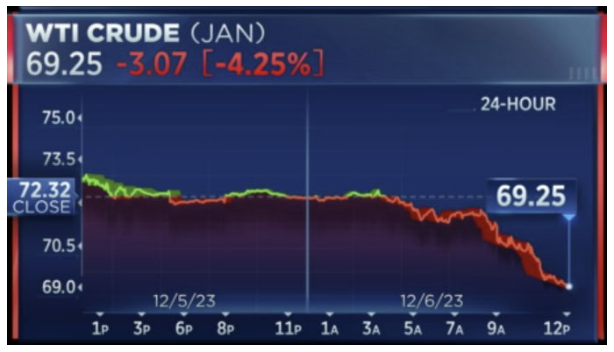 오늘 금리보다 시장의 눈길을 더 끈 것이 있었습니다. 유가 폭락입니다. 서부텍사스산 원유(WTI)는 4.1% 급락해 배럴당 69.38달러에 거래됐습니다. 5거래일 연속 하락하면서 배럴당 70달러 밑으로 떨어졌는데, 이는 지난 7월 3일 이후 5개월 만입니다. 브렌트유도 3.8% 내린 배럴당 74.30달러를 기록했습니다.