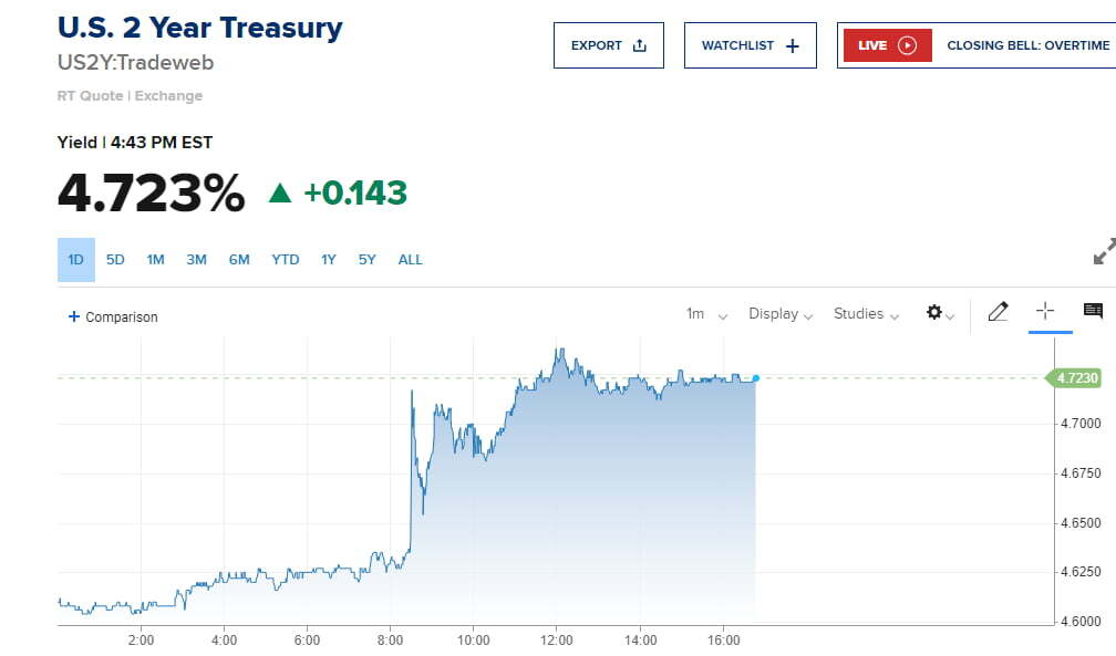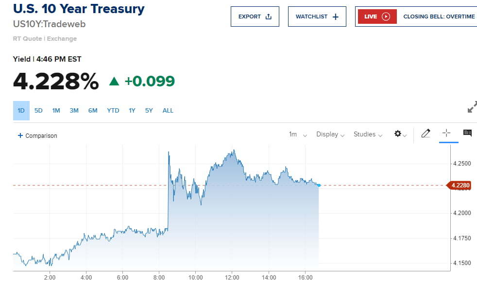 뉴욕 채권시장의 금리는 종일 상승세를 유지했습니다. 오후 4시 40분께 국채 10년물 수익률은 9.9bp 오른 4.228%에 거래됐고, 2년물은 14.3bp 상승한 4.723%를 기록했습니다.