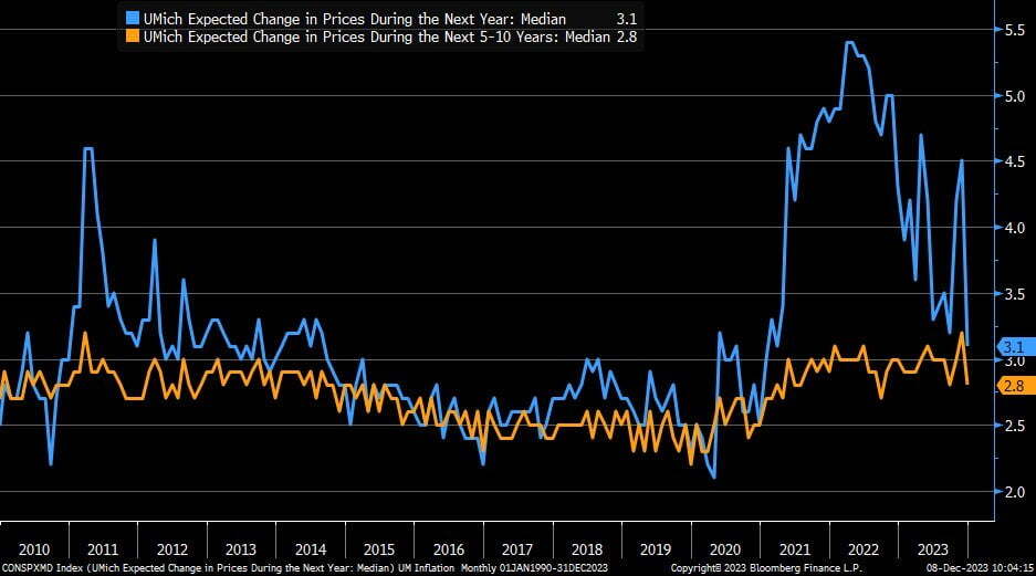 게다가 소비자 기대 인플레이션은 뚝 떨어졌습니다. 1년(단기) 기대 인플레이션은 3.1%로 지난 11월의 4.5%보다 급격히 하락했습니다. 2021년 3월 이후 가장 낮은 것입니다. 전월 대비 1.4%포인트 하락은 2001년 10월 이후 가장 큰 폭이기도 하고요. 물론 아직 팬데믹 이전보다는 높지만요. 5년(장기) 기대 인플레이션도 2.8%로 11월 3.2%보다 확 내려갔습니다. 이는 2022년 9월 이후 최저치입니다.