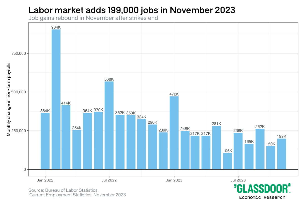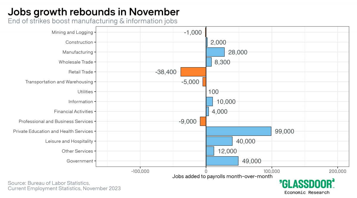 미국자동차노조(UAW) 파업 종료로 자동차 업종에서 3만 개 일자리가, 할리우드 파업 종료로 영화 업종에서 1만7000개 일자리가 생겼습니다. 즉 대규모 파업이 끝나면서 11월에 신규고용 4만7000개가 더해진 것이죠.