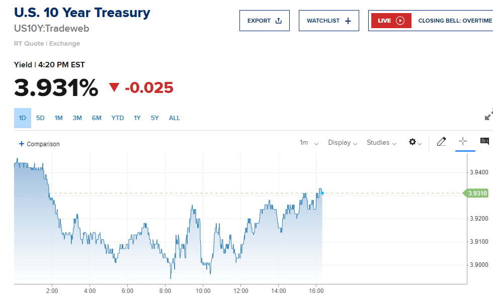 금리는 소폭이긴 하지만 꾸준히 하락세를 유지했습니다. 오후 4시 20분께 미 국채 10년물 수익률은 2.5bp 하락한 3.931%, 2년물은 1.5bp 내린 4.441%에 거래됐습니다.