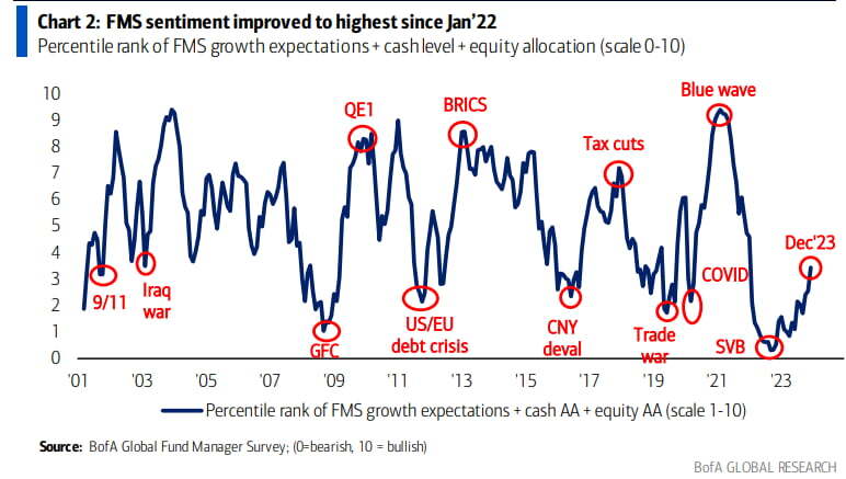 뱅크오브아메리카는 "12월 펀드 매니저들의 정서는 2022년 1월 이후 가장 낙관적이었다"라고 정리했습니다.