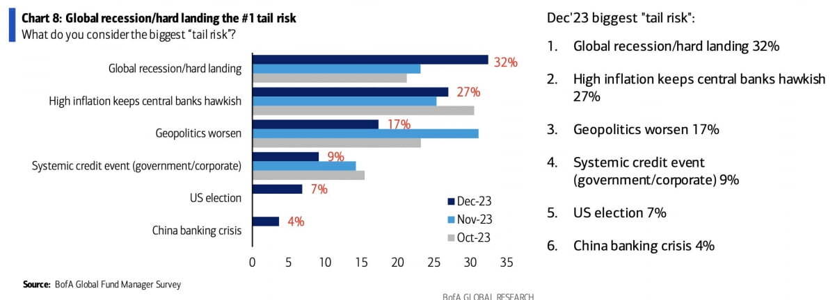 ▶가장 큰 ‘꼬리 위험’으로는 2024년 경착륙(32%)을 가장 많이 꼽았습니다. 높은 인플레이션이 중앙은행을 매파적으로 만들 가능성(27%), 지정학적 긴장(17%) 등이 뒤를 이었습니다.