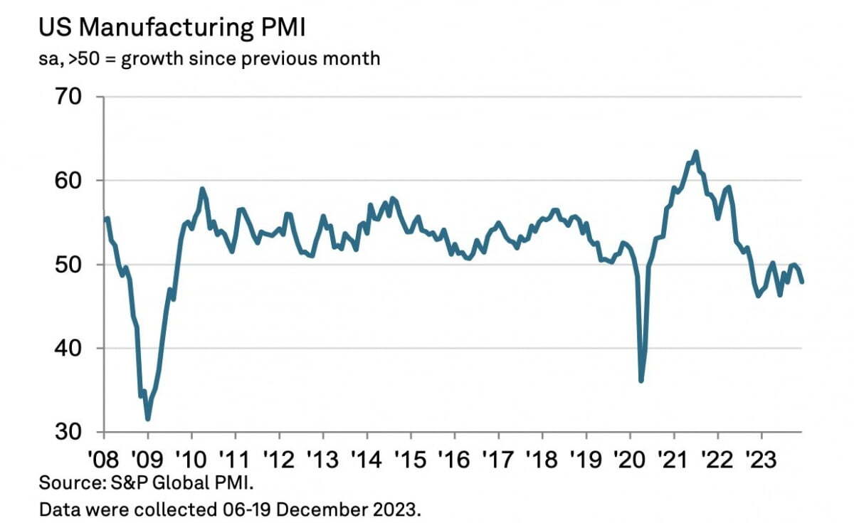 S&P 글로벌이 발표한 미국의 12월 제조업 PMI는 47.9로 집계되었습니다. 11월 49.4뿐 아니라 월가 예상 48.2도 밑돌았습니다. 제조업이 위축 국면(50 이하)에서 더 위축되고 있다는 얘기입니다. 크리스 윌리엄슨 S&P글로벌 수석 이코노미스트는 "더 많은 기업이 잉여 생산 능력에 대한 우려를 갖게 되면서 노동력을 석 달 연속으로 줄였다. 제조업은 지난해 4분기 미국 경제에 부정적 요인으로 작용했을 것"이라고 설명했습니다.