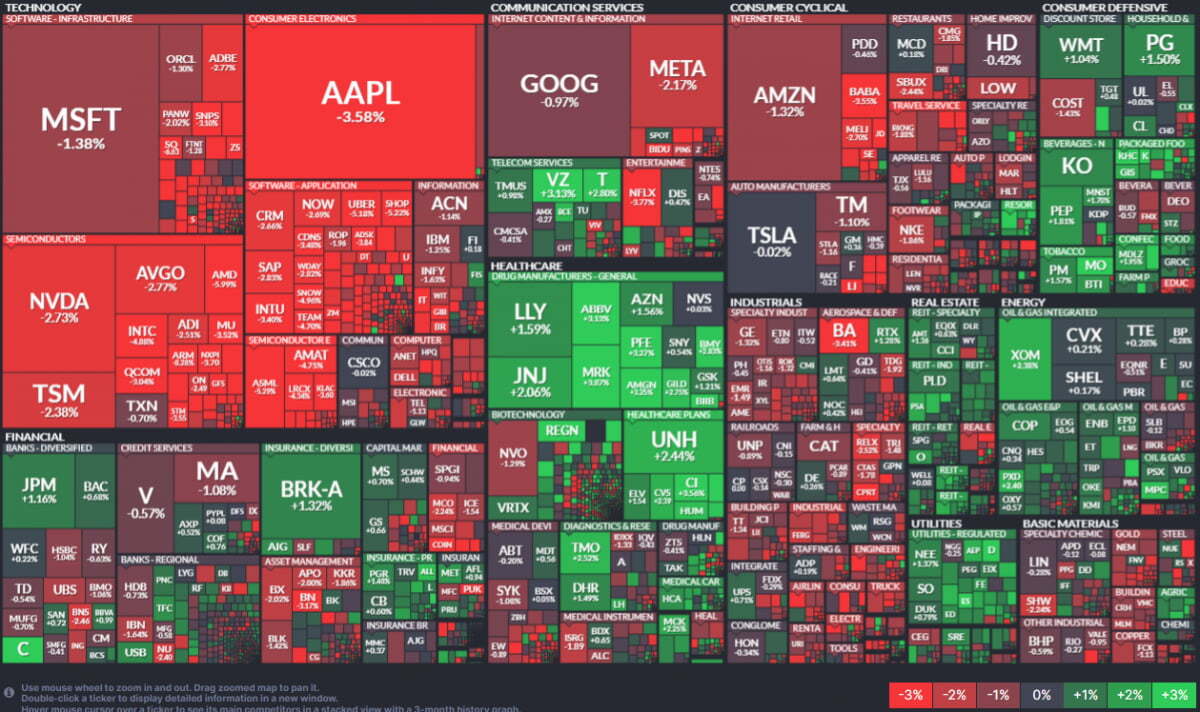 이에 애플 주가는 3.58% 급락했습니다. 한때 하락 폭이 4%를 넘기도 했습니다. 마이크로소프트(-1.38%) 아마존(-1.32%) 메타(-2.17%) 등 지난해 시장 상승을 주도하며 급등했던 매그니피선트 7(M7) 주식들도 대부분 큰 폭으로 떨어졌습니다.