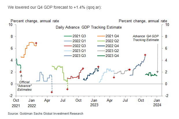 경기 둔화는 걱정할 정도는 아닙니다. 하지만 오늘 경제 데이터가 나온 뒤 골드만삭스는 미국의 4분기 GDP 성장률 추정치를 1.4%(기존 1.5%)로 낮췄습니다. 애틀랜타 연방은행의 GDP나우도 기존 2.3%에서 2.0%로 하향 조정했습니다.