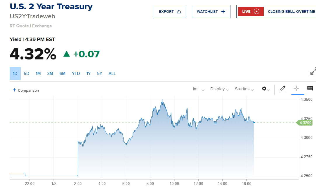 이로 인해 2일 뉴욕 채권시장이 열리자 아침부터 금리가 치솟기 시작했습니다. 10년물 수익률은 한때 4.024%까지 오르기도 했습니다. 유가가 갑자기 하락세로 전환하면서(WTI는 1.77% 하락한 배럴당 70.38달러로 거래 마침) 한때 10bp 넘게 오르던 미 국채 10년물 수익률 상승 폭이 줄었지만, 상승세는 지속했습니다. 결국, 오후 4시 40분께 10년물 수익률은 7.7bp 상승한 3.937%에 거래됐습니다. 2년물은 7bp 오른 4.32%를 기록했습니다.