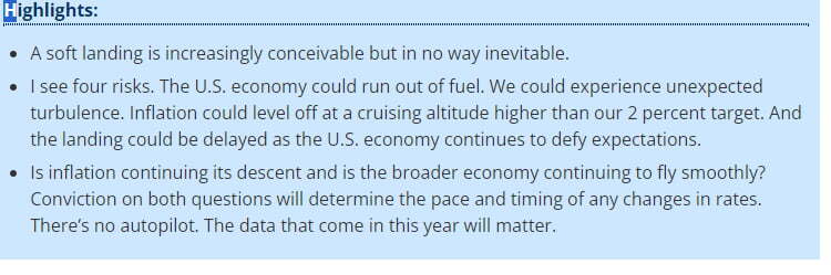 새해 첫 발언에 나선 토마스 바킨 리치먼드 연방은행 총재의 연설도 약간 매파적이었습니다. 그는 "금리 인하의 속도와 시기는 인플레이션은 계속 하락하고 경제는 계속 순조로울지 두 가지 질문에 대한 확신에 따라 결정될 것이다. 오토파일럿(자동 조종 장치)은 없으며 올해 들어오는 데이터가 중요하다"라고 말했습니다. 그는 경제가 강력하게 성장하면서 예상과 달리 노랜딩(no landing) 상황이 계속되면 추가 금리 인상 옵션이 여전히 테이블 위에 있다고 말하기도 했습니다. 바킨 총재는 올해 FOMC 투표권자입니다.