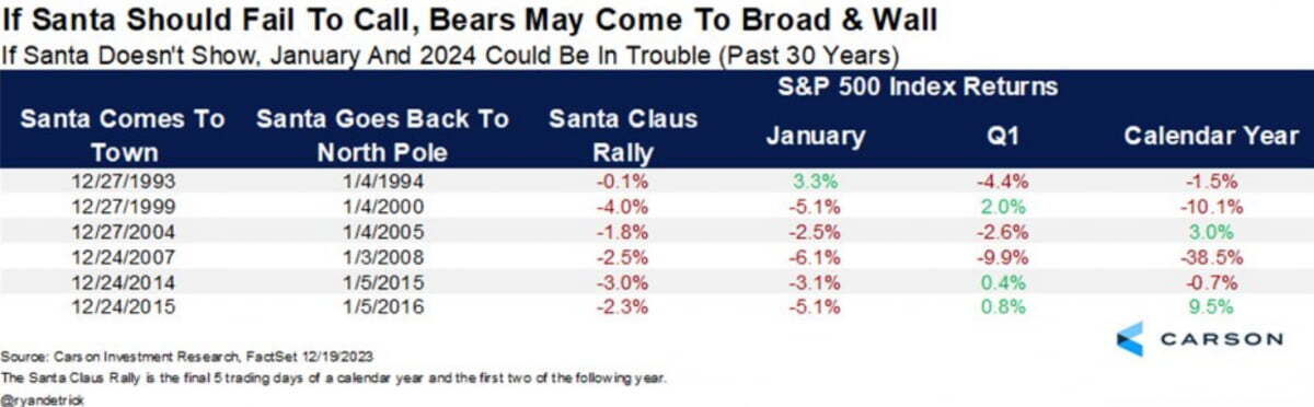 이로 인해 산타 랠리는 결국 하락세로 마감되었습니다. 연말 5거래일, 올해 초 2거래일 동안 S&P500 지수가 0.9% 하락한 것이죠. 카슨그룹에 따르면 지난 30년 동안 산타 랠리에 실패한 경우가 6번 있었습니다. 그중 5번은 1월에도 주가가 떨어졌고, 그해 전체로 따져도 4번이나 하락세를 보였습니다. 카슨그룹의 라이언 디트릭 전략가는 "1년 중 가장 낙관적인 7일 기간에 주가가 상승하지 않았다. 산타가 오지 않았는데 이는 단기적 경고일 수 있다. 9주 연속 상승세를 이어간 증시는 아마도 휴식을 취해야 할 시간일 수 있다"라고 말했습니다.
