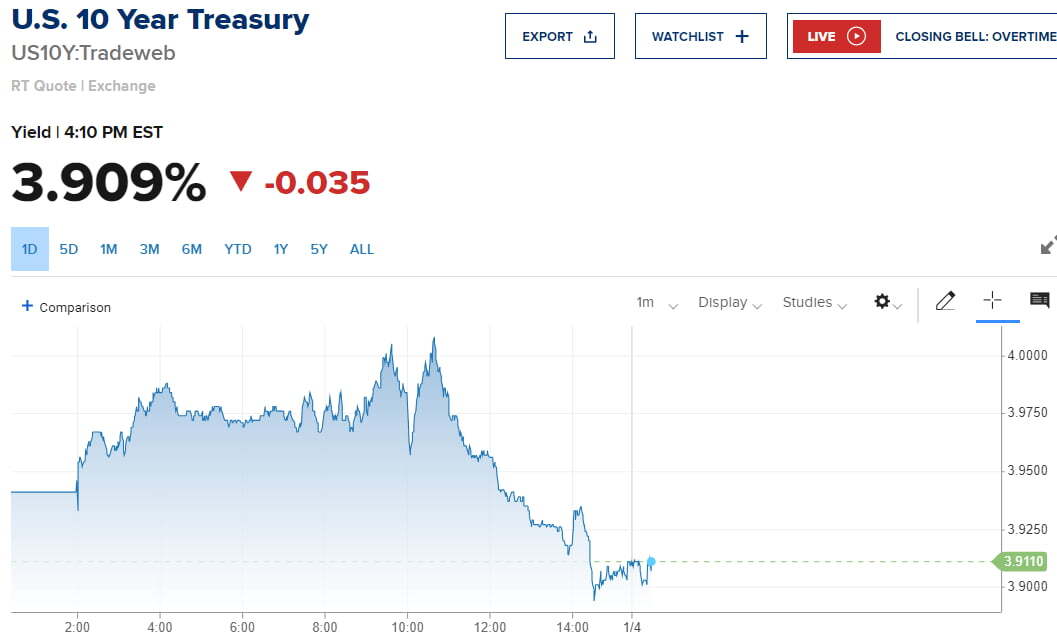 3일(미 동부시간) 뉴욕 금융시장에서는 아침부터 금리가 상승세를 보였습니다. 미 국채 10년물 수익률은 한때 4.01%를 기록하기도 했습니다. 휴가에서 돌아온 채권 트레이더들이 지난해 말 급락한 수익률에 대해 재평가를 하고 있다는 관측이 나왔습니다.