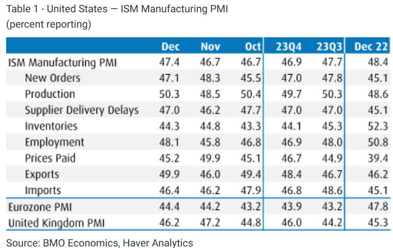 미 공급관리협회(ISM)가 발표한 12월 제조업 구매관리자지수(PMI)는 47.4로 집계됐습니다. 예상치 47.2나 11월 46.7보다 높았습니다. 예상보다는 선방했지만, 14개월 연속 50을 밑돌면서 위축 국면이 이어지고 있음을 보여줬습니다. 이는 닷컴버블이 터진 2000~2001년 이후 가장 긴 위축 기간입니다. 티머시 피오레 조사위원장은 "제조업은 계속 위축세를 나타냈지만 12월 업황은 11월보다는 조금 더 느린 속도로 둔화했다"라고 밝혔습니다.