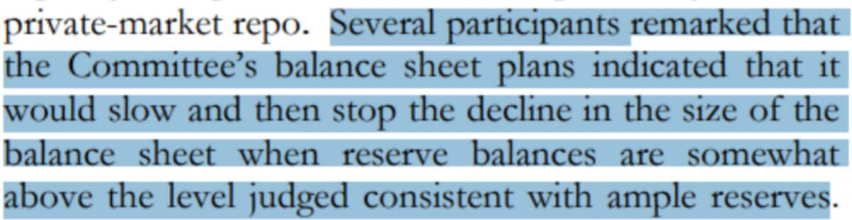월가 일부에서는 양적 긴축(QT)에 대한 문구를 주목했습니다. 회의록에서는 △"몇몇 참가자는 은행준비금 잔액이 충분한 수준보다 다소 높을 때 대차대조표 감축 규모를 줄이고 그 뒤 멈춰야 한다고 언급했다" △"그런 결정이 내려지기 훨씬 전에 기술적 요인에 대해 논의를 시작하는 것이 적절하다고 제안했다"라고 기술했습니다.