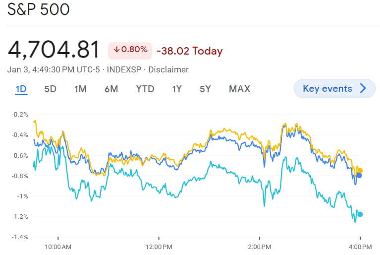 아침부터 금리가 오르자 주가도 이틀째 하락세로 출발했습니다. 작년 말 랠리는 상당 부분 금리 하락, 유가 하락에 힘입은 것이었는데 그런 요인이 사그라지고 있으니까요. 뉴욕 증시의 주요 지수는 0.3~0.7% 하락세로 거래를 시작했습니다.
