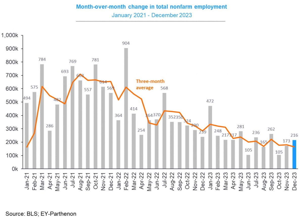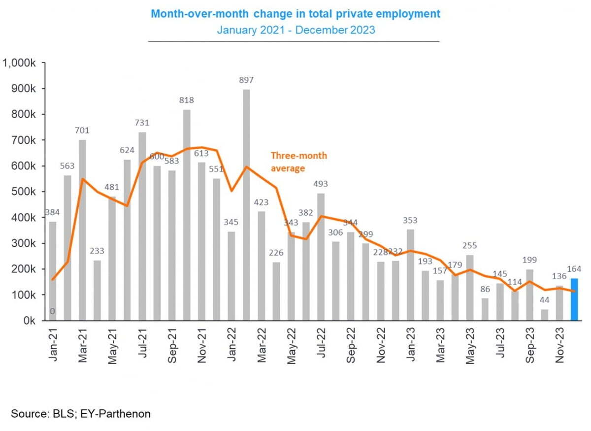 ① 우선 지난 두 달간의 고용 수치가 7만1000개 하향 조정이 됐습니다. 11월 수치는 19만9000개였던 것이 2만6000개 줄어든 17만3000개로 바뀌었고요. 10월 수치는 4만5000개 감소해 15만 개가 10만5000개로 수정됐습니다. 이에 따라 지난 3개월간 월평균 신규고용은 16만5000개로 2023년 전체 월평균 22만5000개, 2023년 하반기 월평균 19만3000개보다 적습니다. 둔화 추세는 이어지고 있는 것이죠.