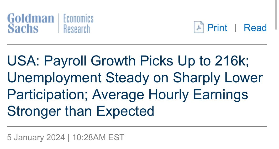 바이탈 날리지의 애덤 크리사펄리 설립자는 "시간당 임금 상승률이 뜨거웠고 참여율이 하락했다. 이 모든 것은 시장의 이른 금리 인하 기대와 멀리 떨어져 있음을 시사한다"라고 말했습니다.