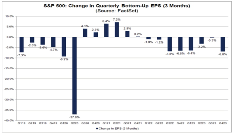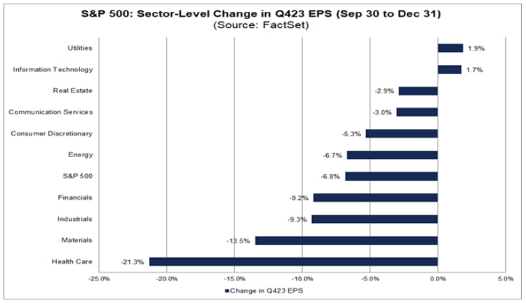 팩트셋에 따르면 월가의 S&P500 기업의 4분기 주당순이익(EPS) 추정치는 전년 동기보다 1.3% 증가한 53.9달러입니다. 3분기에 이어 2개 분기 연속으로 증가하는 것이죠. 하지만 월가 애널리스트들은 지난 석 달간 6.8% 낮췄습니다. 작년 9월 30일에는 57.86달러로 봤었는데 지금은 53.9달러까지 떨어뜨린 것이죠. 팩트셋은 "일반적으로 애널리스트들은 해당 분기 동안 이익 추정치를 낮춘다"라면서도 지난 10년간 해당 분기의 평균 EPS 하락률은 3.5%라고 지적했습니다. 통상적인 조정 폭보다 더 많이 낮춘 것이죠. 11개 업종별로 보면 9개 업종에서 4분기 EPS 추정치가 감소했습니다. 헬스케어(-21.3%)와 소재(-13.5%) 부문이 가장 컸습니다. 반면, 유틸리티(+1.9%)와 IT(+1.7%) 부문은 EPS 추정치가 증가한 유일한 두 업종이었습니다.