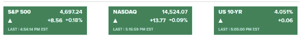 10년물 수익률은 뚝 떨어져 하락세로 전환했습니다. 3.953%까지 내려가기도 했습니다. 그리고 주가는 상승세를 그렸습니다. 나스닥은 오전 11시께 0.8% 상승하기도 했습니다.