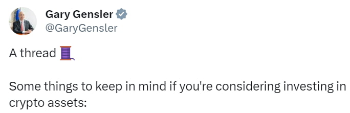 SEC의 게리 겐슬러 위원장은 X(트위터)를 통해 "암호화폐에 투자를 고려하고 있다면 명심해야 할 몇 가지 사항이 있다"라며 세 가지를 지적했습니다. ⑴ 암호화폐 자산 투자/서비스를 제공하는 사람들은 연방 증권법을 포함한 해당 법률을 준수하지 않을 수 있다 ⑵ 암호화폐 자산에 대한 투자는 매우 위험할 수 있으며 변동성이 큰 경우가 많다 ⑶ 사기꾼들은 암호화폐 자산의 인기 상승을 계속 이용하여 소매 투자자를 사기로 유인하고 있다라는 것입니다. 이는 시장에서 현물 ETF 승인을 전제로 한 경고로 여겨졌습니다.
