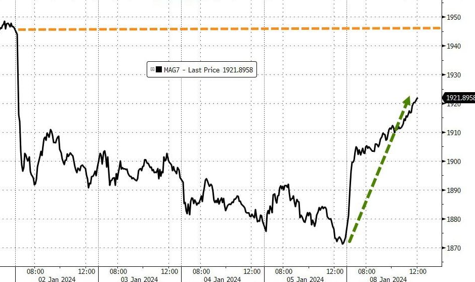 새해 들어 비틀대던 뉴욕 증시가 8일(미 동부시간) 지난 주말 사이에 발생한 뉴스로 인해 힘을 되찾았습니다. '야성적 충동'이 되살아나자 투자자들은 다시 매그니피선트 7(M7) 주식에 몰렸습니다. 엔비디아가 사상 최고가를 갈아치우는 등 M7 주식은 올해 들어 하락 폭의 75%를 하루 만에 되찾았습니다.
