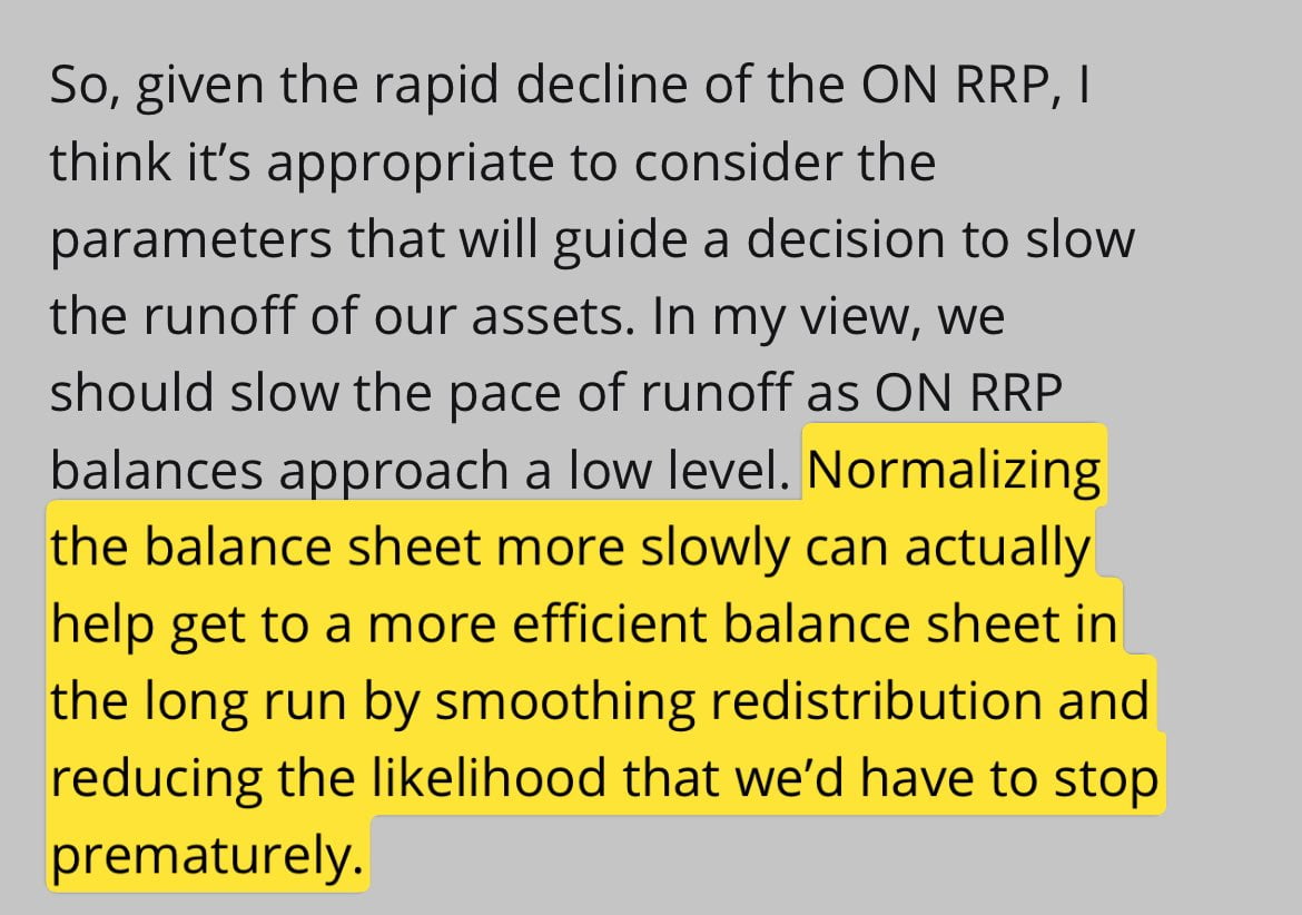 물론 로건 총재의 말은 QT를 끝내자는 게 아니었습니다. 그는 "대차대조표를 좀 더 천천히 정상화하면 (시장 변동성에 따른) 갑작스러운 중단 가능성을 줄여 장기적으로 더 효율적 대차대조표에 도달하는 데 도움이 된다"라는 것이었지요.
