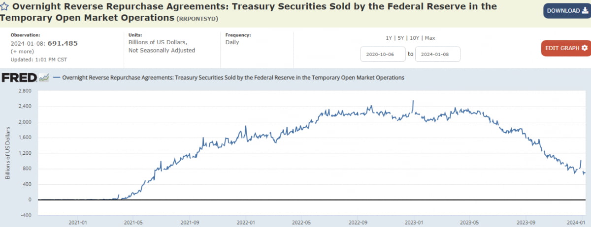 미 중앙은행(Fed)은 2022년 6월부터 양적 긴축(QT)을 시작해 지금은 매달 950억 달러씩 보유 채권을 줄이고 있습니다. 9조 달러에 육박했던 대차대조표는 지난 3일 기준 7조6810억 달러로 약 1조3000억 달러가량 감소했습니다. 그런데 시장의 '잉여 유동성'을 대변하는 역레포 시장의 잔액이 작년 말 최고 2조5000억 달러에서 최근 6000억 달러 수준으로 감소하자 이런 QT의 속도를 줄여야 한다고 주장한 것입니다. 오늘 역레포 시장에는 6914억 달러가 모였습니다.